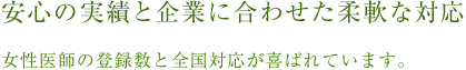 女性産業医ならではの相談のしやすさ、コミュニケーション力を活かし従業員の心と体の健康を支援致します。女性特有の悩みや相談に親身にご対応頂ける女性産業医が数多く登録しており、女性の割合が多い企業(コールセンター・航空会社・化粧品会社 等)で活躍されています。 |